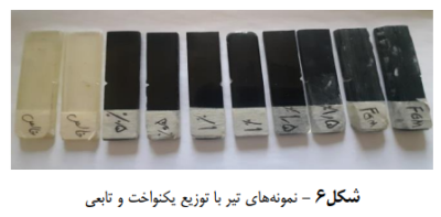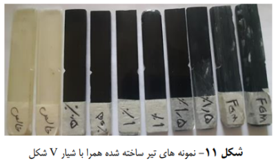 حرارات وارد شده باعث اتصال لایه ها به یک دیگر و ممزوج شدن آنها در مرز لایه ها خواهد شد . در آخر نمونه به دست آمده به لحاظ ظاهری در راستای ضخامت دارای تغییر رنگ از شفاف تا حالت تیره خواهد بود. نمونه های ساخته شده در شکل 6 نشان داده شده است. ابعاد نمونه های ساخته شده (عرض 20 میلیمتر، طول100 میلیمتر و ضخامت 4 میلیمتر) و تعداد آنها برای هر درصد از نانو ذرات (برای هر نمونه با توزیع و درصد مشخص از نانو ذرات به تعداد 3 عدد) بر اساس استاندارد ISO179/2 می باشد.