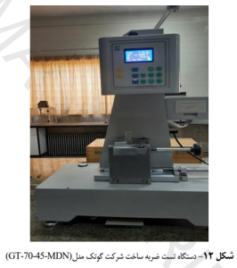 بعد از آماده سازی هر یک از نمونه ها و قرار دادن آن میان تکیه گاه ها مانند شکل 12، ابعاد ودادههای مورد نیاز دستگاه تست ضربه شامل طول، عرض و ضخامت را وارد نموده و بر اساس استاندارد، آزمایش ضربه انجام می شود. در جدول 2 مقادیر تجربی به دست آمده از آزمایش ضربه ارائه گردیده است.