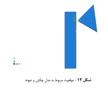 در گام اول، لازم است علاوه بر مدل کردن هندسه نمونه، مدل مربوط به چکش (ضربه زننده) نیز در نظر گرفته شود. این کار در ماژول پارت نرم افزار انجام می شود. بعد از مدل کردن هندسه مساله، لازم است با دستورات چرخش و انتقال مطابق شکل 13، اجزاء در موقعیت مناسب قرار گیرند.