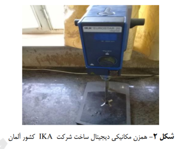 بعد از رطوبت گیری نانو ذرات گرفتن و رسیدن دمای آن به دمای محیط، آن را با اپوکسی مخلوط کرده و به مدت 5 دقیقه به صورت دستی همزده می شود. سپس به مدت 1 ساعت با سرعت 300 دور در دقیقه مطابق شکل 2 با استفاده از همزن مکانیکی ساخت شرکت IKA آلمان، همزده می شود.