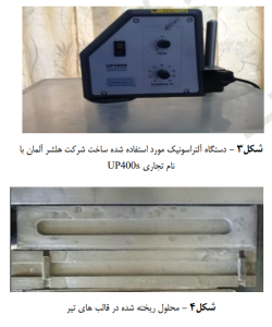 در مرحله ی بعد با استفاده از دستگاه آلتراسونیک ساخت کشور آلمان به منظور جلوگیری از کلوخه شدن نانو ذرات و همچنین توزیع یکنواخت، مخلوط همزده می شود. این مخلوط بافرکانس 50 مگاهرتز و دامنه کاوش 0.5 به مدت یک ساعت مطابق شکل 3 همزده شده و بعد از آن مخلوط را به مدت 15 دقیقه درون دستگاه حمام آلتراسونیک قرار داده شده تا حباب های هوا از بین بروند. سپس هاردنر به مخلوط اضافه میشود و به مدت 5 دقیقه به صورت دستی همزده میشود تا کاملا مخلوط شود و مخلوط را درون قالب های اغشته به واکس مطابق شکل 4 ریخته و در دمای 80 درجه سانتی گراد به مدت 3 ساعت و به دنبال آن 120 درجه سانتیگراد به مدت 12 ساعت قرار داده می شود.