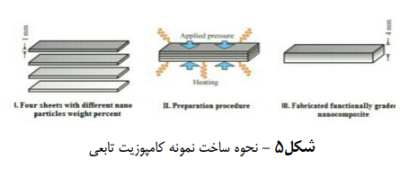 در مرحله ی بعد نمونه های تابعی نیز ساخته میشود. ابتدا نمونه های با درصد وزنی نانوگرافن (5/0، 1، 5/1) با ضخامتmm1 درون قالب های تیر شکل ساخته میشود. سپس مطابق شکل5، این لایه ها درون قالب روی هم از درصد کم تا درصد بالاتر قرارداده شده و تحت نیروی فشاری N1100 و حرارت با دمای 150 درجه سانتی گراد قرار میگیرد.