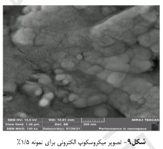 در شکل 8 تصویر نمونه با توزیع یکنواخت نشان داده شده است. همانطور که در تصویر بالا مشاهده میشود، نمونه با توزیع یکنواخت فاقد نانوذرات گرافن کلوخه شده است. همچنین به علت مقاومت پایین مواد پلیمری در برابر حرارت تولید شده در اثر برخورد اشعه الکترونی و توان بالای این اشعه، ترک های ریز در این شکل قابل مشاهده می باشد. لازم به توضیح است که کلوخه شدن با توجه به ابعاد نانو ذرات گرافن و مقیاس تصویر بدست آمده قابل بررسی می باشد. بدین صورت که اگر چسبیدن نانو ذرات به یکدیگر به حدی باشد که اندازه ذره بوجود آمده از مقیاس نانو فراتر رود، آنگاه کلوخه شدن رخ داده است. برای درصد های بالاتر این احتمال افزایش یافته و همان طور که در شکل 9 مشاهده می شود، در 1.5 درصد وزنی کلوخه شدن نانوگرافن مشهود است. مطابق این شکل اتصال نانو ذرات گرافن به یکدیگر، موجب ایجاد سلول های بزرگتر شده که می تواند به عنوان نقاط تمرکز تنش عمل نموده و سبب کاهش خواص مکانیکی گردد.