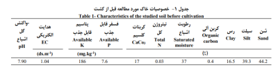 خصوصيات خاك مورد استفاده قبل از كشت در يک نمونه مركب اندازهگيری شحد (جدول 1). توزيع اندازه ذرات خاك به روش هيدورمتری، ميزان كربن آلی به روش والکلی و بلاك، pH گل اشباع، هدايت الکتريکی عصاره اشباع، رطوبت اشباع به روش جرمی، نيتروژن كل به روش كجلدال، كربنات كلسيم معادل به روش خنثی سازی با اسيد، فسفر قابل جذب به روش اولسن و همکاران و پتاسيم قابل جذب، اندازه گيری شدند. نتايج آزمايش خاك مورد مطالعه نشان داد كه خاك از لحاظ عناصر غذايی نيتروژن، فسفر و پتاسيم و ميزان ماده آلی جهت كشت زعفران دارای كمبود است.