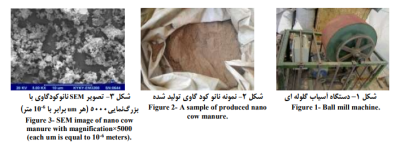 جهت نانو كردن كود گاوی از دستگاه آسياب گلوله ای استفاده شد (شکل 1). اين نوع آسياب ها از قدرتمندترين ابزارهای توليد نانو ذرات در مقياس صنعتی به حساب می آيند كه دارای شکل استوانه ای يا استوانه ای- مخروطی هستند و نيروی خردكننده آن ها را گلوله هايی از جنس مواد سخت تشکيل می دهد. اين گلوله ها با شدت زياد به مواد درون استوانه برخورد كرده و آن ها را خرد می كنند. كود گاوی پس از فرايند پوسيده شدن، در گرمخانه در دمای 60 درجه سانتيگراد به مدت 24 ساعت خشک شده و سپس وارد مخزن آسياب گلوله ای شد. در اثر برخورد گلوله ها به مدت 48 ساعت و 60 دور در دقيقه كود گاوی به ذارت نانومتری تبديل شد (شکل 2 ). در اين آزمايش نانو كود گاوی در اندازه های با ميانيگن 70 نانومتر توليد شدند. جهت اطمينان از حصول نتايج پيش بينی شده مبنی بر نانو بودن ذرات حاصل، نمونه گيری انجام شد و توسط دستگاه ميکروسکوپ الکترونی روبشی، عکسبرداری انجام گرفت (شکل3).