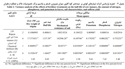 نتايج تجزيه واريانس اثر تيمارهای كود گاوی و شيميايی بر نيمه عمر كود گاوی، ميزان نيتروژن، فسفر و پتاسيم برگ، خصو صيات خاك و عملکرد زعفران در جدول شماره 2 نشان داده شده است.