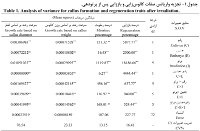 نتایج تجزیه واریانس صفات کالوس زایي و باززایي پس از پرتودهي آن در جدول 1 ارائه شده است. پس از پرتوتابي، اثر رقم بر درصد باززایي، سرعت رشد بر اساس وزن و سرعت رشد قطر کالوس و اثر نوع جنین بر درصد باززایي و درصد رطوبت معني دار شد. اثر پرتو برای تمام صفات مورد بررسي معنيدار بود. اثر متقابل رقم×جنین نیز فقط برای درصد باززایي و درصد رطوبت معنيدار شد. اثر متقابل رقم×پرتو برای تمام صفات معني دار شد. اثر متقابل جنین×پرتو و رقم×جنین×پرتو فقط برای درصد باززایي معنيدار شدند (جدول 1).